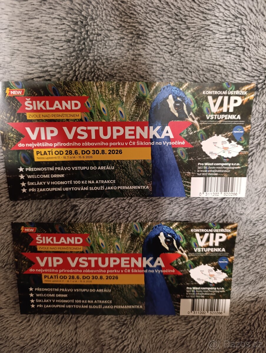 4x VIP vstupenka ŠIKLAND - [22.1. 2026]Prodám 4 ks VIP vstupenek na rok 2026 do největšího přírodního zážitkového parku v ČR - ŠIKLAND. Nevyužiji.