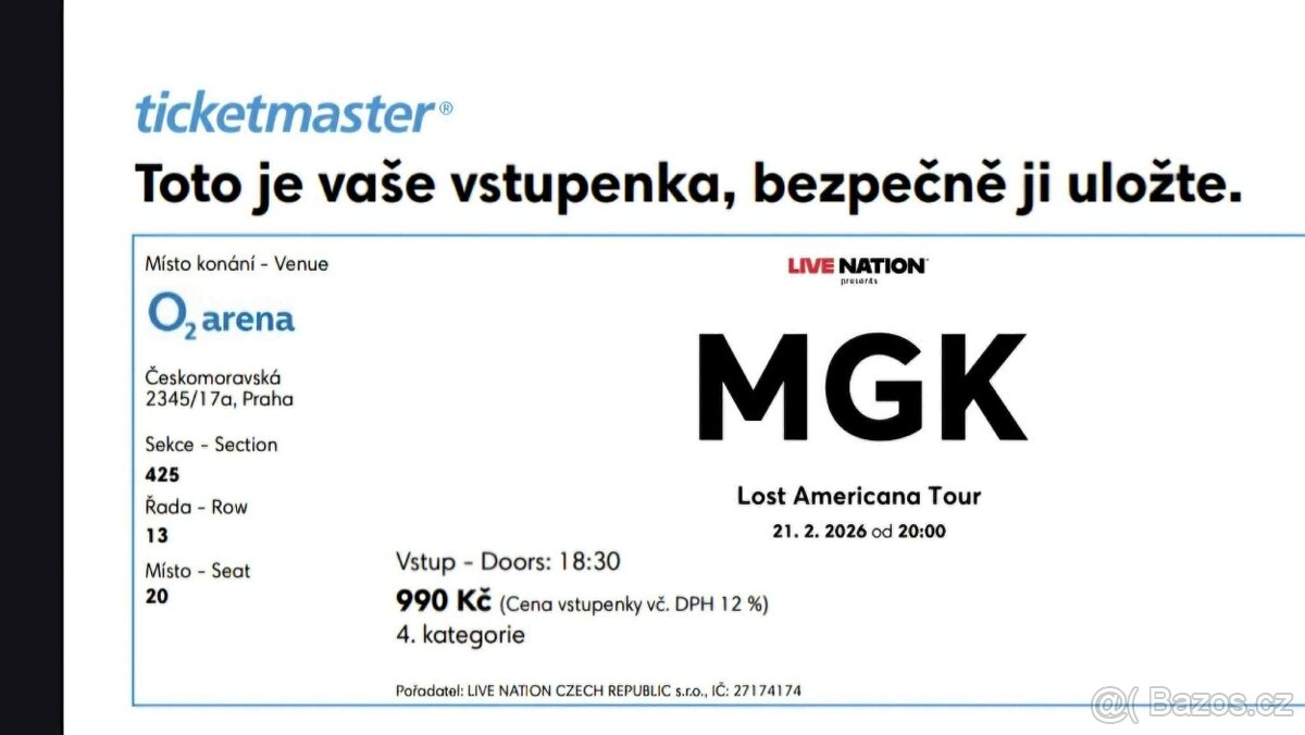 Nabízím lístky na koncert MGK v Praze. Jedná se o místa k sezení - sektor 425 řada 13 a sedadla 19 a 20. Cena je uvedena za oba lístky. Prodám přes libovolnou variantu - osobní předání, přeposlání s předešlým ověřením, ticketswape a další.