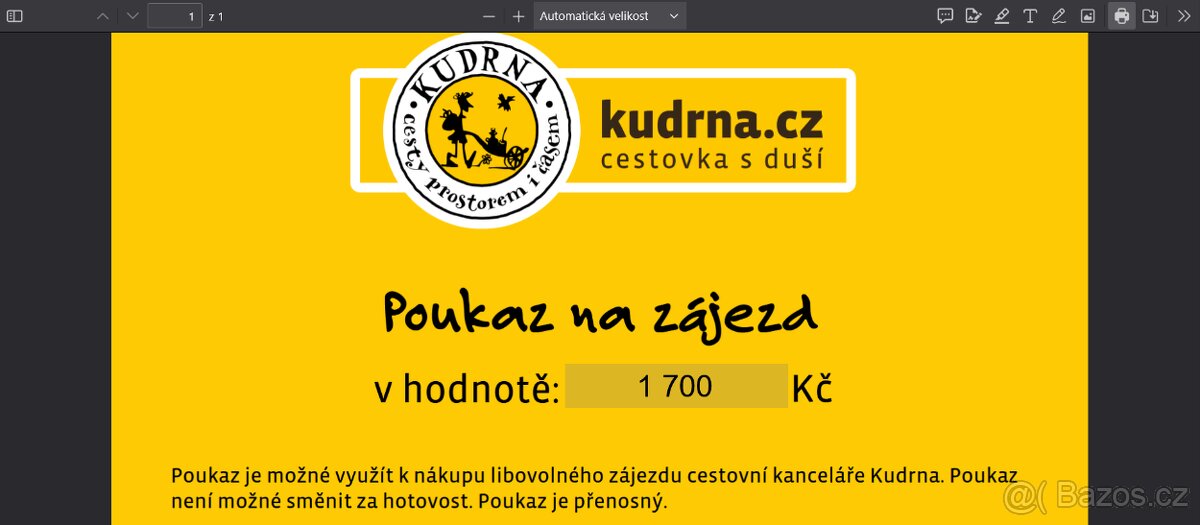 Prodám dárkový poukaz na libovolný zájezd od CK Kudrna v hodnotě 1700,-. Platnost poukazu je do 31. 8. 2026.