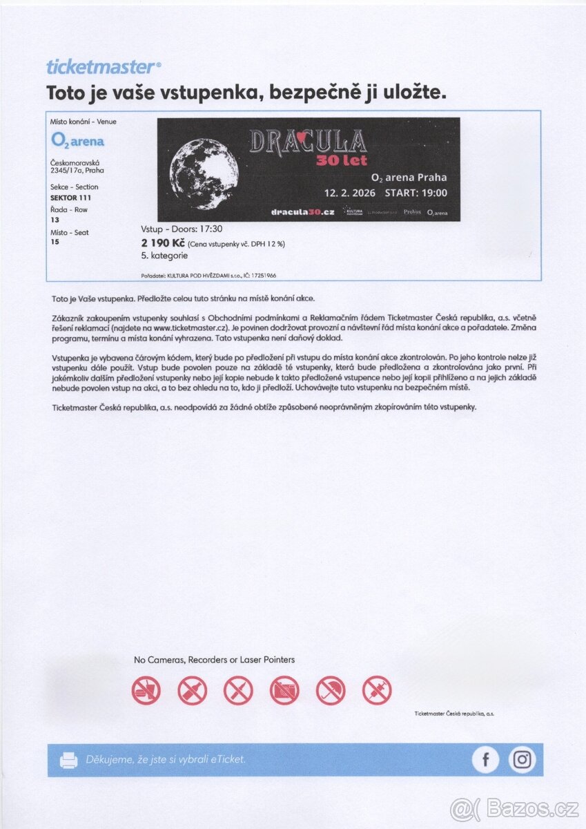 Nabízím k prodeji 2x lístky vedle sebe na výroční hudební představení Dracula. Lístky jsou do sektoru 111, řada 13, místo 14 a 15. Cena 3.000 Kč za obě vstupenky. Lístky nabízím z důvodu nemoci.