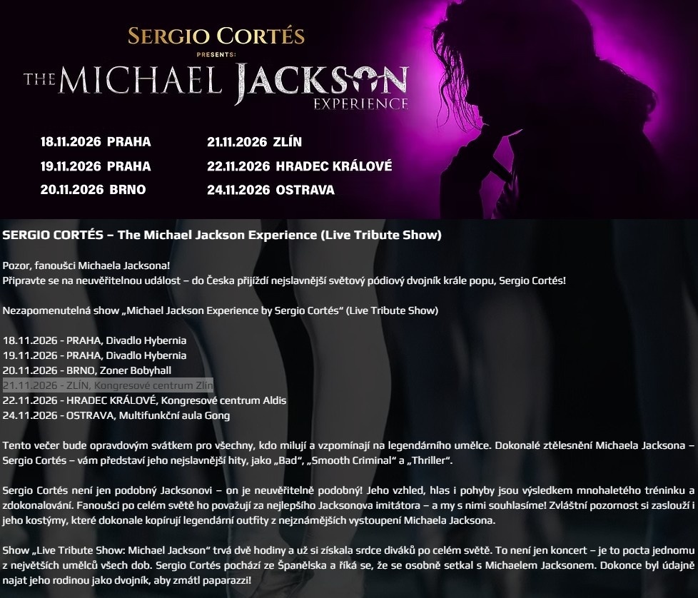 SERGIO CORTÉS – The Michael Jackson Experience. Cena jedné vstupenky 1690 Kč. Pouze osobní předání, nejde o padělek - mohu ukázat doklad o zaplacení.