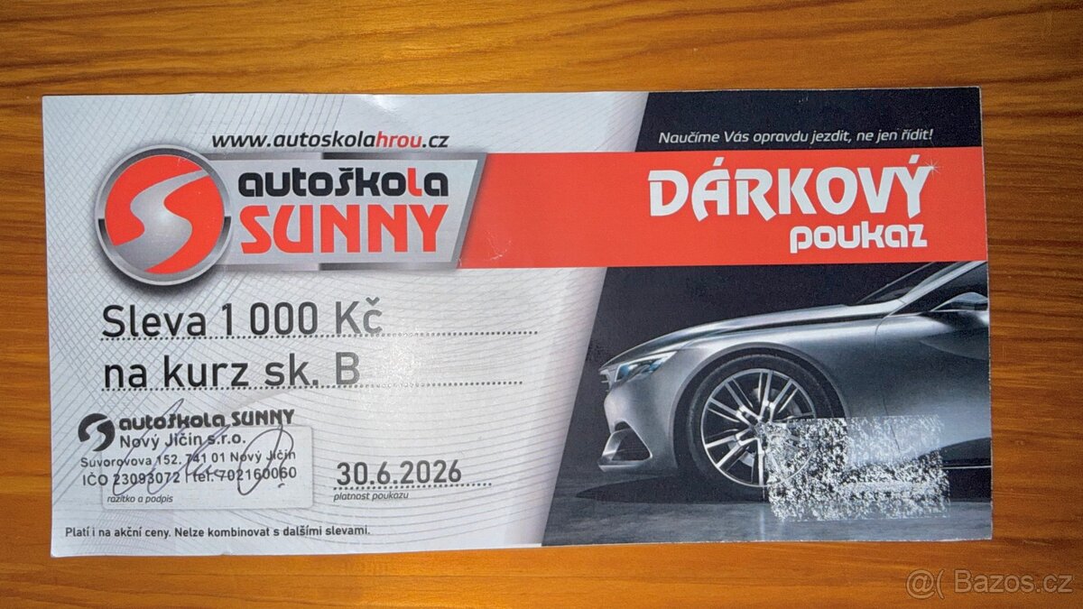 Prodám slevový poukaz v hodnotě 1000 Kč na kurz skupiny B (osobní automobil) u autoškoly SUNNY v Novém Jičíně.