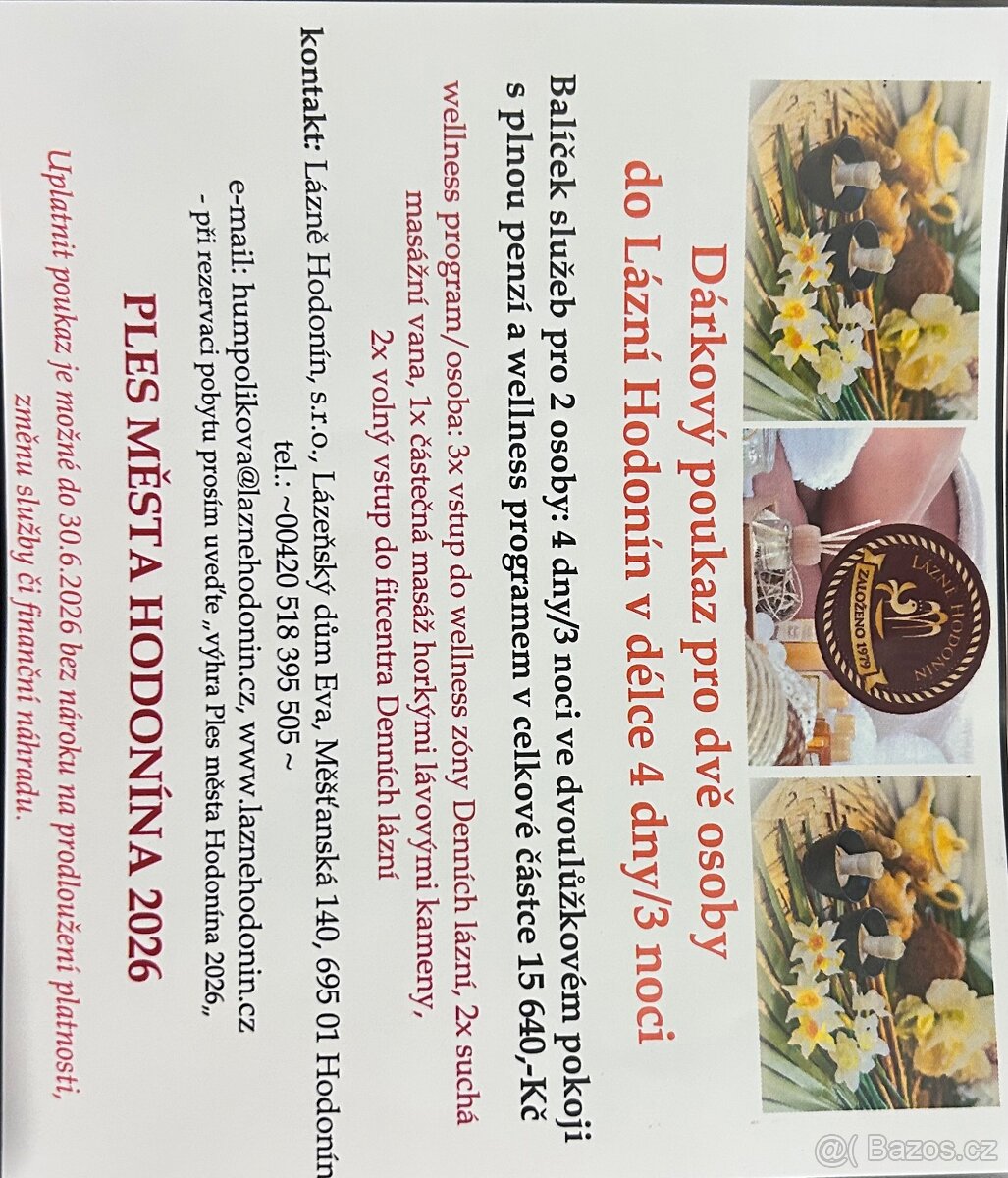 Dárkový poukaz pro 2 osoby do Lázní Hodonín v délce 4 dny/3 noci.