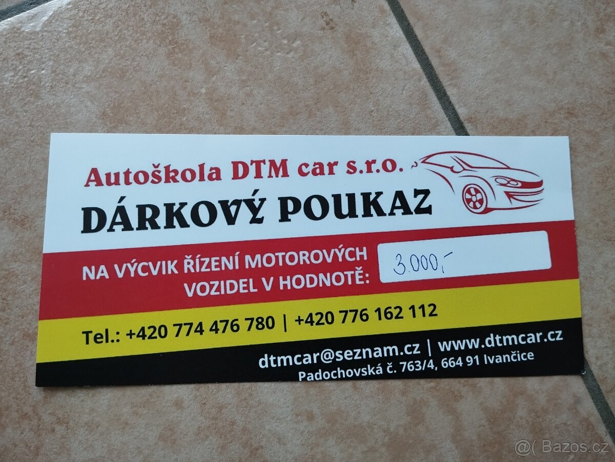 Nabízím dárkový poukaz do autoškoly platnost do 12/2026 v hodnotě 3000 Kč.