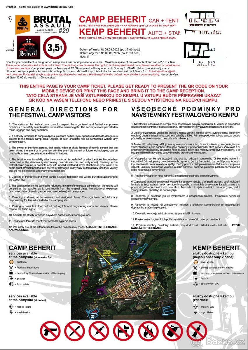 Prodám vstupenku na Brutal Assault + předplacený camp. Nabízím 1× vstupenku na Brutal Assault včetně předplaceného campu pro dvě osoby. Součástí je stan, matrace a parkovací místo do 3,5 t. Prodávám ze zdravotních důvodů.