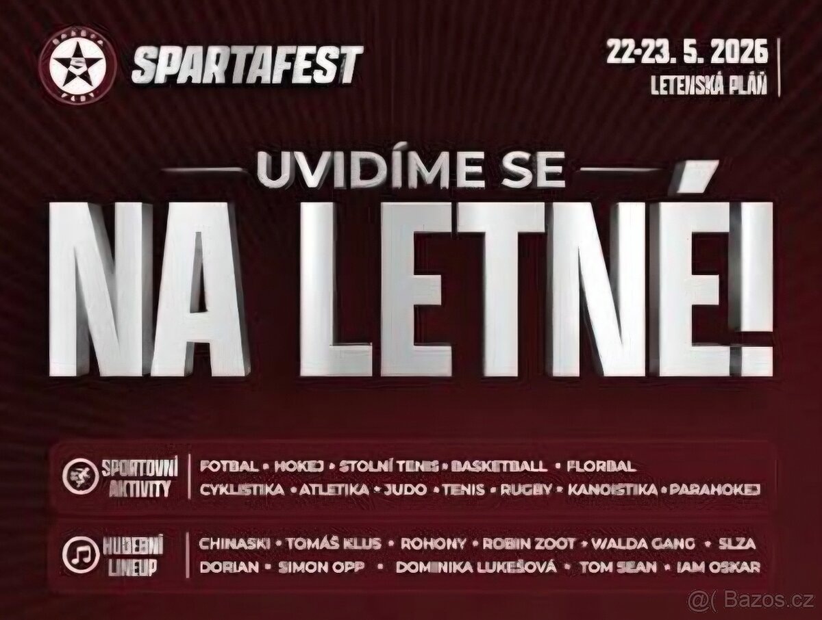 SPARTA FEST 22. - 23.5. rodinná vstupenka - [27.4. 2026]Prodám rodinnou celofestivalovou vstupenku na SPARTA FEST 22. - 23.5. 20026 na Letenské pláni.